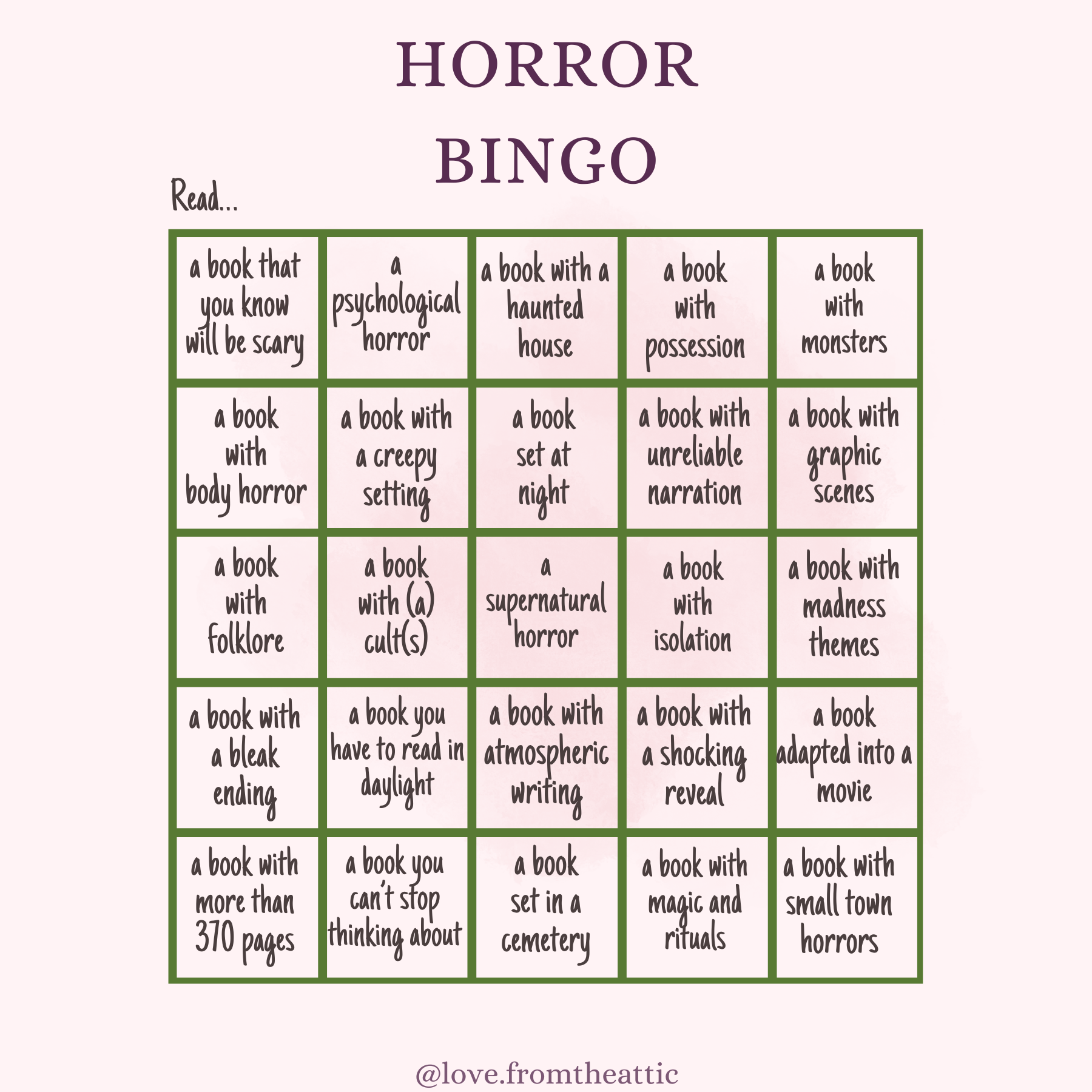 The Horror bingo card is for readers who love being unsettled. From atmospheric dread to psychological tension, this card guides you through the many shades of fear the genre has to offer. Whether you prefer subtle creepiness or full on terror, this bingo card turns scary reads into a thrilling challenge