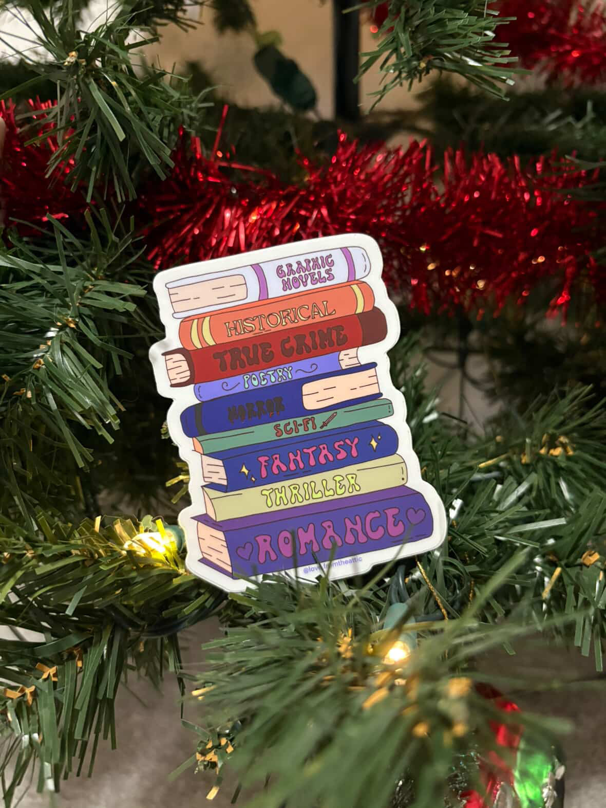 A sticker featuring a stacked bookshelf of popular genres—perfect for book lovers who read across Graphic Novels, True Crime, Romance, and more