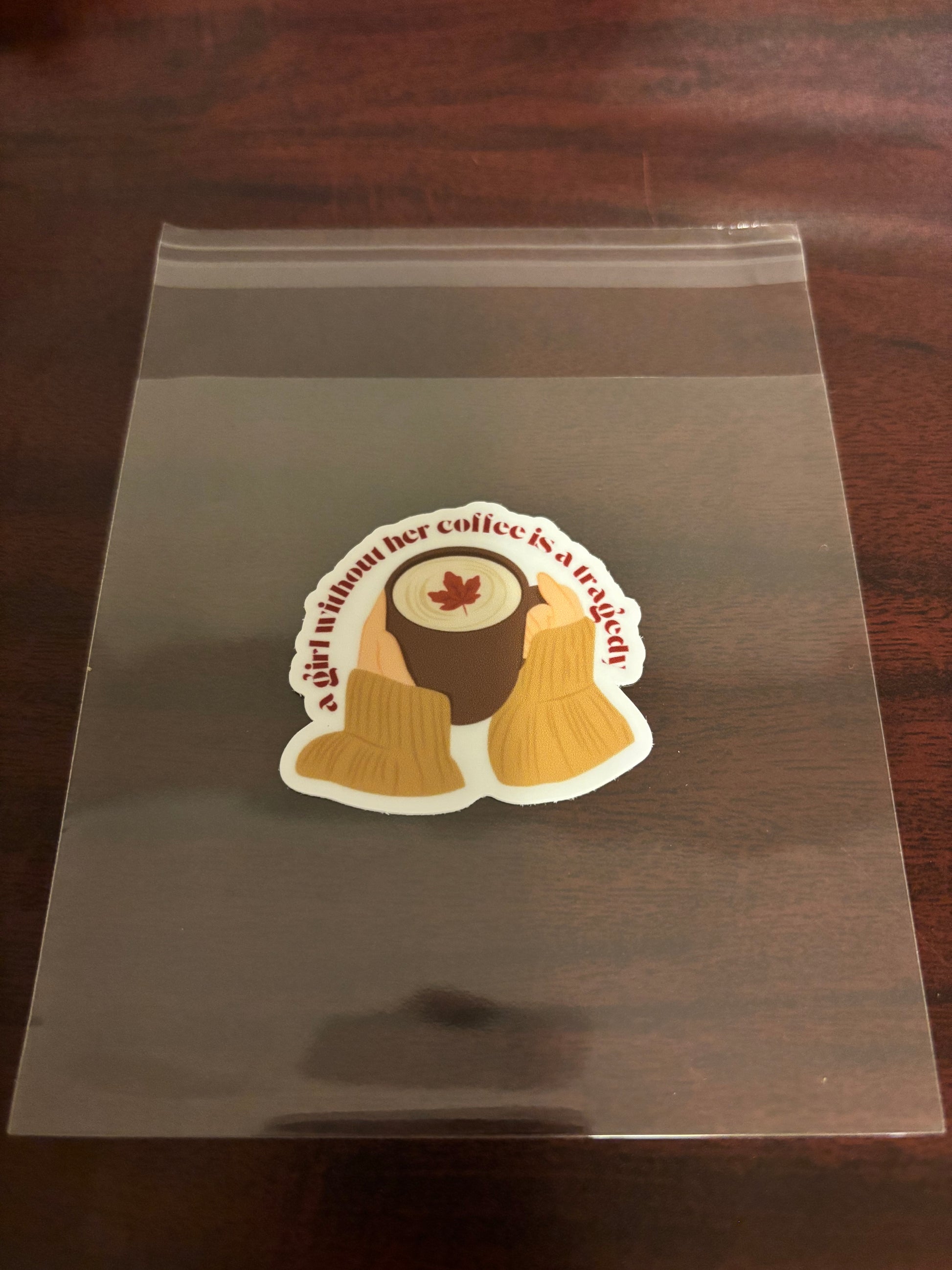 Inspired by a beloved line from Fourth Wing, this autumn sticker features a latte topped with a maple leaf, wrapped in the phrase “a girl without her coffee is a tragedy.” Perfect for readers, coffee lovers, and anyone who treats their morning brew like a survival mantra, this sticker brings the perfect blend of bookish energy and fall comfort to your water bottle, laptop, or reading journal