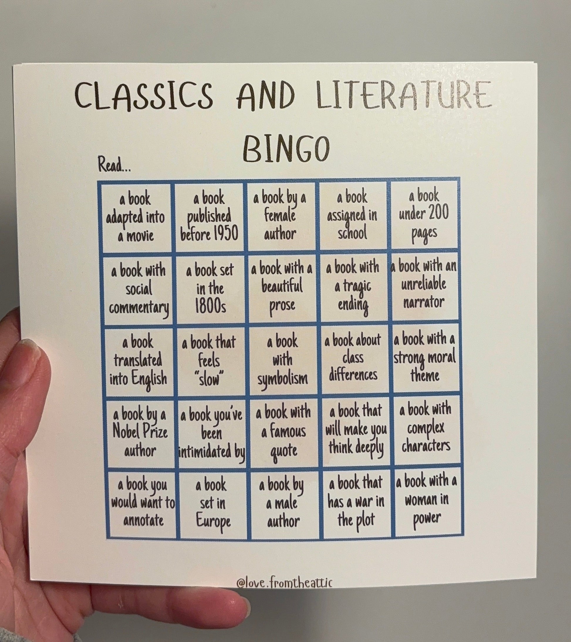 The Classics & Literature bingo card invites you to slow down and savor timeless stories. From beautiful prose to thought provoking themes, this card helps you explore influential works you may have avoided or rushed through in the past. Ideal for readers who love annotating, reflecting, and discovering why these books have endured for generations
