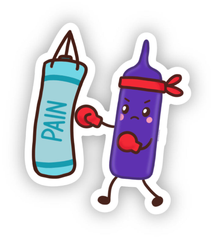This tough little sucrose is taking swings at a punching bag labeled ‘PAIN,’ reminding us all to keep pushing through the hard stuff. Mostly, aiding our babies in PAIN because they can’t specifically describe the pain. Perfect for laptops, water bottles, or journals as a daily boost of motivation and resilience
